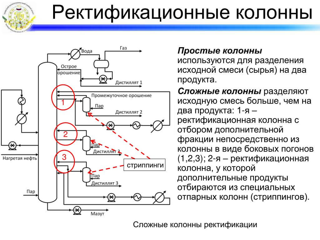 - В ректификационных колоннах нефть делят на несколько фракций: бензиновую, керосиновую, дизельную и мазут. Колонны представляют собой аппараты для разделения жидких смесей, компоненты которых кипят при разной температуре.