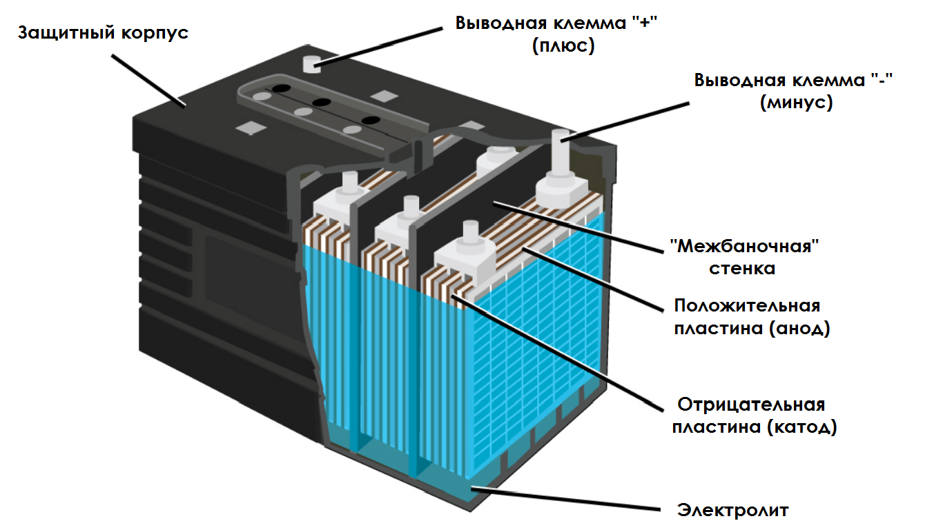 Используемые повсеместно АКБ соответствуют стандарту ГОСТ Р 53165-2008 и относятся к категории стартерных. Аккумулятор выглядит как батарея из шести последовательно соединенных секций, напряжение в каждой из которых составляет 2 В. Элементы размещаются в одном корпусе, разделенном на изолированные отсеки. В них – пакеты из электродов (сепараторов) и разделительных пластин. В каждую секцию заливается водный раствор серной кислоты (электролита).