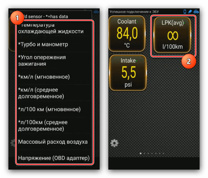 Под динамическими параметрами подразумеваются несколько характеристик двигателя, таких как обороты в минуту, режимы работы топливной системы, температура и расход воздуха, и прочее. Конкретный набор отображаемых параметров и возможность управления ими зависит от автомобиля и его ЭБУ.