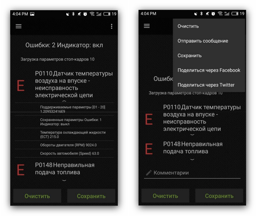 Диагностический режим позволяет просмотреть возникающие ошибки, и, что самое главное, показывает их описания. Плюс полученные данные можно отправить в социальные сети или по электронной почте – например, для связи с сервисным центром или знакомым автомастером.