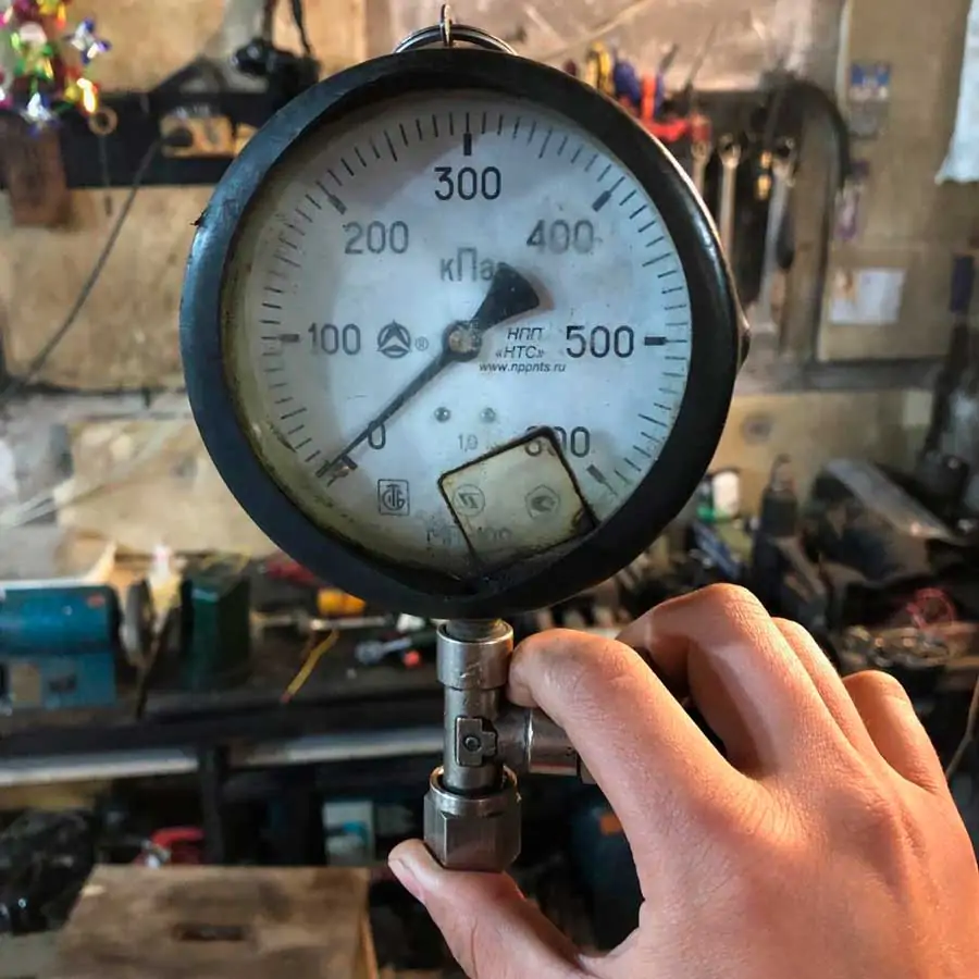 - Бываю случаи, когда владелец жалуется на потерю тяги кратковременно или в жару. В таком случае нужна проверка на ходу. Цепляем манометр, проверяем герметичность контакта со штуцером, чтобы не было течи бензина. Закрепляем прибор на лобовое стекло, можно под дворник, и едем. Если во время движения давление топлива падает, нужно заменить бензонасос, фильтра, продуть магистрали.