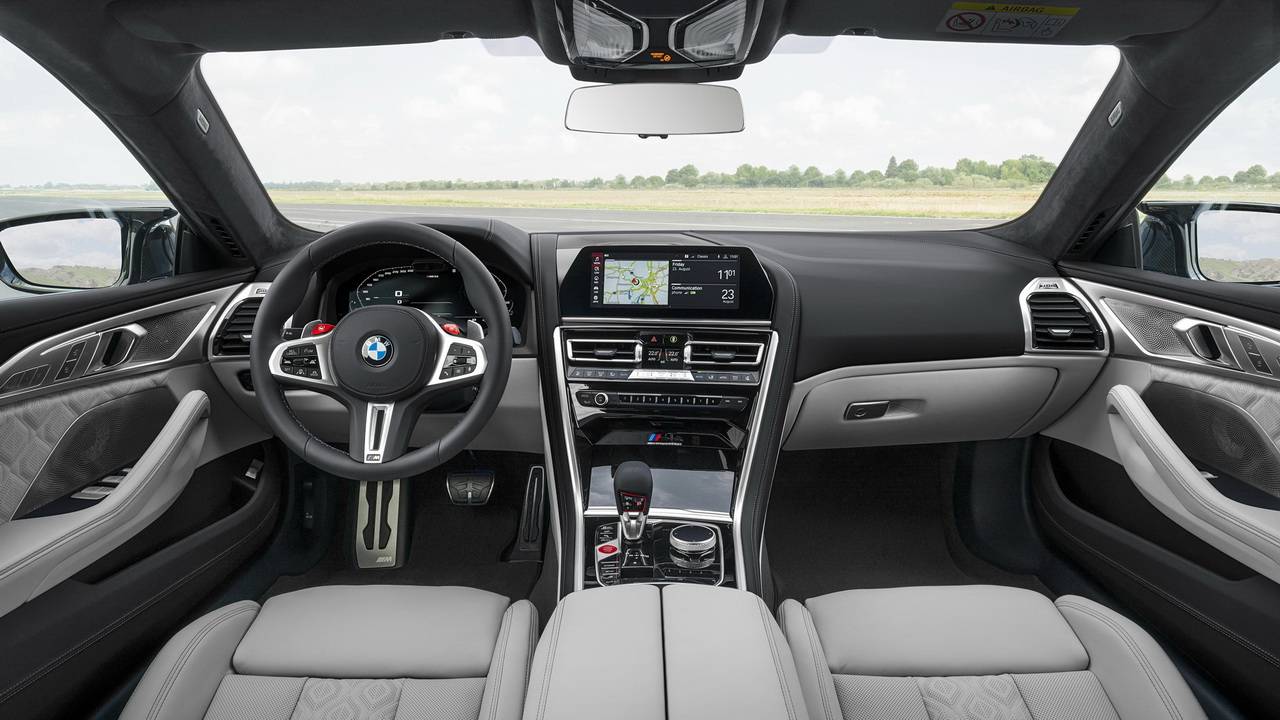 Интерьер «зажигалок» M8 Gran Coupe и M8 Competition Gran Coupe имеет специфическую отделку с ярко выраженным уклоном в «спорт». В наличии вся соответствующая атрибутика – руль с красными клавишами M1/M2 для выбора режима езды, красная кнопка пуска двигателя на центральном тоннеле, рельефные кресла со встроенными подголовниками и трехмерной стежкой, оригинальный селектор КПП с переключателем Drivelogic, декоративные вставки из карбонового волокна. Обивка салона у «эмок» кожаная, но для версии Competition опционально предлагается двухцветная отделка с применением алькантары.