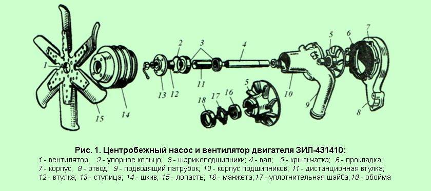 На рисунке 1 представлен жидкостный насос и вентилятор двигателя ЗИЛ-431410, который состоит из корпуса 7, крыльчатки 5 и корпуса 10 подшипников, соединенных между собой через прокладку 6.