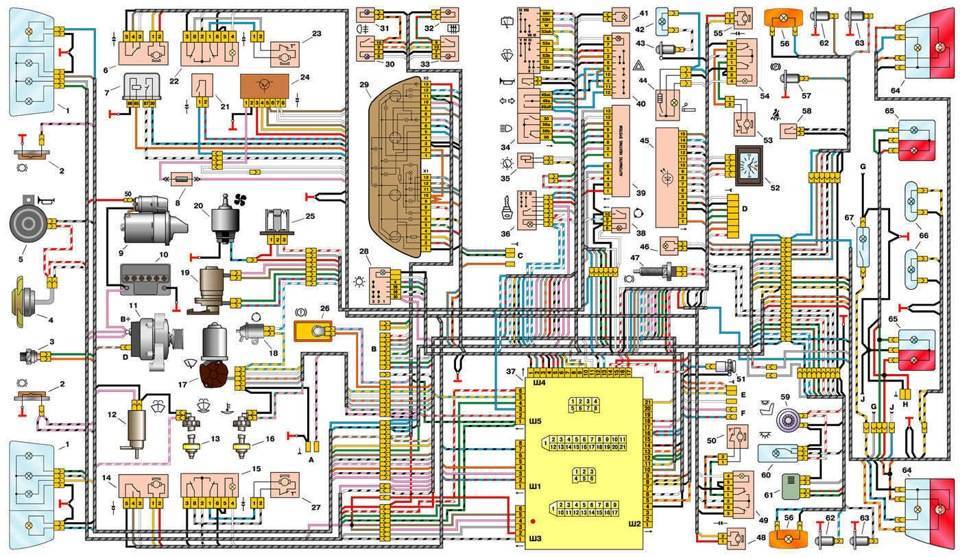 1 — блок-фара 2 — датчики износа колодок передних тормозов 3 — выключатель света заднего хода 4 — электродвигатель вентилятора системы охлаждения двигателя 5 — звуковой сигнал 6 — моторедуктор блокировки замка правой передней двери 7 — реле включения электростеклоподъемников 8 — предохранитель на 8 А 9 — стартер 10 — аккумуляторная батарея 11 — генератор 12 — электродвигатель омывателя ветрового стекла 13 — датчик уровня омывающей жидкости 14 — моторедуктор блокировки замка левой передней двери 15 — переключатель электростеклоподъемника левой передней двери 16 — датчик уровня охлаждающей жидкости 17 — моторедуктор очистителя ветрового стекла 18 — клапан рециркуляции 19 — микромоторедуктор привода заслонки отопителя 20 — электродвигатель отопителя 21 — выключатель замка багажника 22 — переключатель электростеклоподъемника правой передней двери 23 — моторедуктор электростеклоподъемника правой передней двери 24 — блок управления системы блокировки замков дверей 25 — дополнительный резистор электродвигателя отопителя 26 — датчик уровня тормозной жидкости 27 — моторедуктор электростеклоподъемника левой передней двери 28 — переключатель наружного освещения 29 — комбинация приборов 30 — выключатель заднего противотуманного света 31 — контрольная лампа противотуманного света 32 — контрольная лампа обогрева заднего стекла 33 — выключатель обогрева заднего стекла 34 — подрулевой переключатель 35 — выключатель освещения приборов 36 — выключатель зажигания 37 — монтажный блок 38 — выключатель клапана рециркуляции 39 — контроллер отопителя 40 — выключатель аварийной сигнализации 41 — лампа освещения рычагов управления отопителем 42 — лампа освещения вещевого ящика 43 — выключатель лампы освещения вещевого ящика 44 — прикуриватель 45 — блок индикации бортовой системы контроля 46 — лампа освещения пепельницы 47 — выключатель сигнала торможения 48 — моторедуктор блокировки замка левой задней двери 49 — переключатель электростеклоподъемника левой задней двери 50 — моторедуктор электростеклоподъемника левой задней двери 51 — розетка для переносной лампы 52 — часы 53 — моторедуктор электростеклоподъемника правой задней двери 54 — переключатель электростеклоподъемника правой задней двери 55 — моторедуктор блокировки замка правой задней двери 56 — боковой указатель поворота 57 — выключатель контрольной лампы стояночного тормоза 58 — датчик ремня безопасности водителя 59 — плафон направленного света 60 — плафон освещения салона 61 — датчик температуры воздуха в салоне 62 — выключатель в стойке передней двери 63 — выключатель в стойке задней двери 64 — наружный задний фонарь 65 — внутренний задний фонарь 66 — фонари освещения номерного знака 67 — фонарь освещения багажника