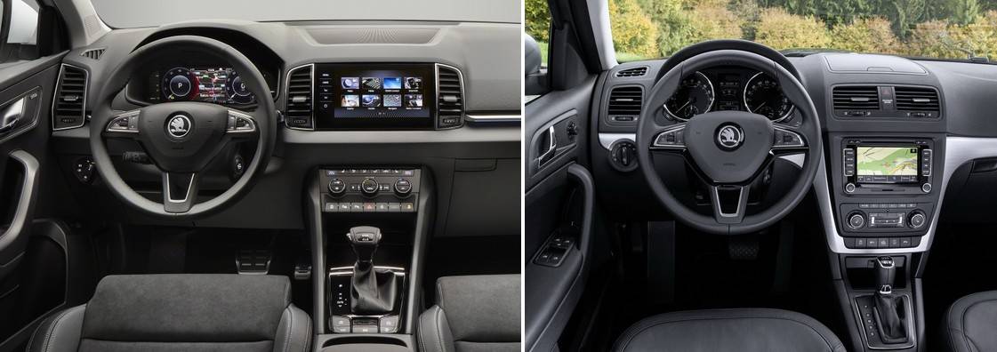 А вот внутри у Skoda Karoq и Yeti различий не так уж много, учитывая, что автомобили были выпущены в разных десятилетиях. Общая концепция и стиль чешского производителя в салонах обоих конкурентов чувствуется сильно. Никакой дороговизны или изящности. Только необходимые вещи, без которых водителю и пассажирам не обойтись.