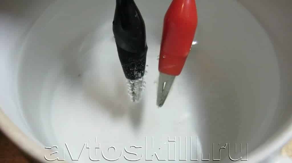 Если у вас нет под рукой мультиметра, для проведения операции удобно использовать воду. Жидкость наливается в емкость, например, в стакан. От аккумулятора отходят два провода с клеммами. Их погружают в воду и внимательно наблюдают за поводками. В результате электролиза жидкости на отрицательной клемме появятся пузырьки.