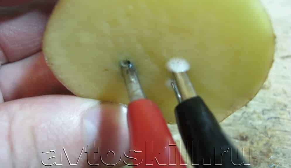Можно использовать и другой метод, для которого требуется картофель. Разрежьте сырой картофель на две половинки. Вставьте провода, подключенные к источнику питания, в картофель. Результат появится через 10 минут. Рядом с положительной клеммой появится зеленая точка.