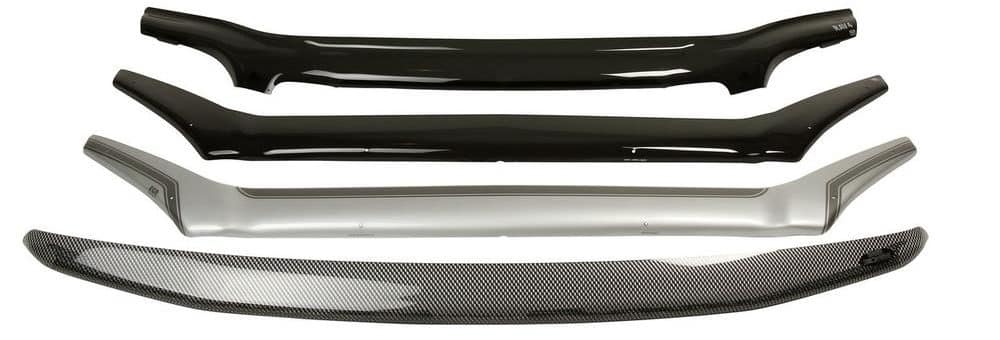 Мухобойка на капот (так еще называют дефлектор) продается в нескольких вариантах исполнения. На прилавках магазинов можно отыскать дымчатые, тонированные или карбоновые устройства. Деталь направляет от автомобиля движущиеся воздушные массы, возникающие в районе передних фар авто и направляющиеся вдоль капота к лобовому стеклу. Осуществляя выбор ветровика, его прикладывают к кузовному элементу. Это необходимо для того, чтобы удостовериться в наличии необходимого для продувания промежутка между поверхностью капота и дефлектором.