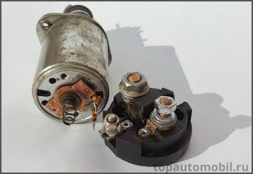 Не вращается якорь электродвигателя – нет контакта на «пятаках» силовых болтов или повреждена силовая пластина подвижного контакта втягивающего. Возможны причины неисправностей электрической части двигателя, рассмотренные во втором этапе.