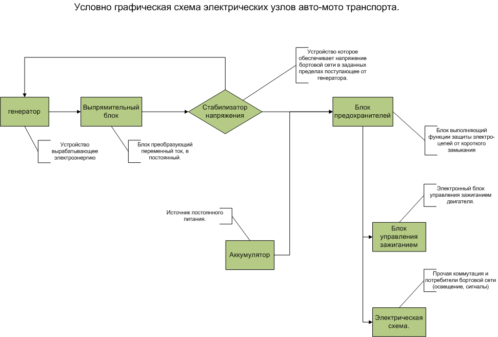 — Генератор. — Выпрямительный блок. — Стабилизатор напряжения (Регулятор) . — Источник питания. — Блок предохранителей. — Блок управления зажиганием. — Электрическая схема потребителей (стартер, свет, повторители и прочее.)