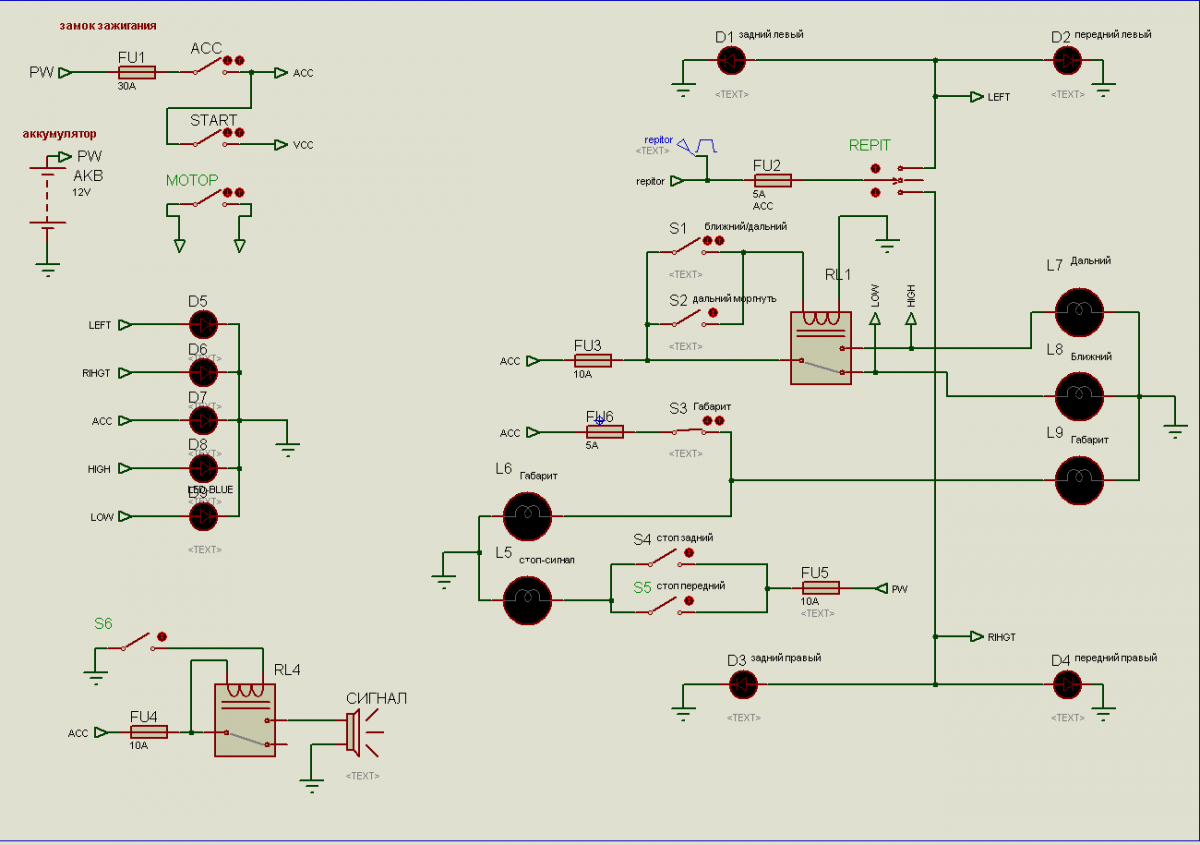 Предложенная схема выполнена на реле (RL), лампах (L), светодиодах (D) и переключателях (S). Так же в схеме присутствуют предохранители обозначены (F). На схеме отсутствует реле повторителей, что на самом деле является генератором импульсов и реле, при включении которое замыкает и размыкает контакты. Вместо реле повторителей на схеме подключен генератор (repitor), а сам переключатель поворотов подписан «REPIT» Питание схемы производится через подключение PW, в эту же точку приходится подключение от реле-регулятора подающего питание от генератора. Блок зажигания здесь не представлен. На светодиодах D5-D9 собрана эмуляция приборной доски, при включении того или иного потребителя, индикация происходит на данной панели. Ближний свет — LOW (L8), дальний свет — HIGH (L7), правая сторона повторителей — RIGHT (D1, D2), левая сторона повторителей — LEFT (D3, D4).