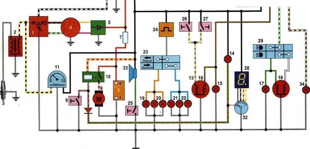 1 — модуль зажигания (CDI); 2 — катушка зажигания;3 — свеча зажигания; 4 — генератор; 5 — регулятор напряжения; 6 — батарея; 7 — предохранитель; 8 — стартёр; 9 — кнопка “Пуск”; 10 — пусковое реле; 11 — тахометр; 12 -замок зажигания; 13- стоп-сигнал; 14 — индикатор нейтрали КПП; 15 — подсветка приборов; 16 — фара; 17 — индикатор дальнего света; 18 — задний габарит; 19 — индикатор левого поворота; 20 — указатель левого поворота; 21 — индикатор правого оборота; 22 — указатель правого поворота; 23 — переключатель указателей поворота; 24 — реле-прерыватель; 25 — кнопка включения звукового сигнала; 26 — выключатель стоп-сигнала ручного тормоза; 27 — выключатель стоп-сигнала ножного тормоза; 28 — цифровой индикатор скорости КПП; 29 — переключатель света; 30 — выключатель освещения; 31 — охранная сигнализация; 32 — переключатель цифрового индикатора скорости; 33 — звуковой сигнал; 34 — передний габарит