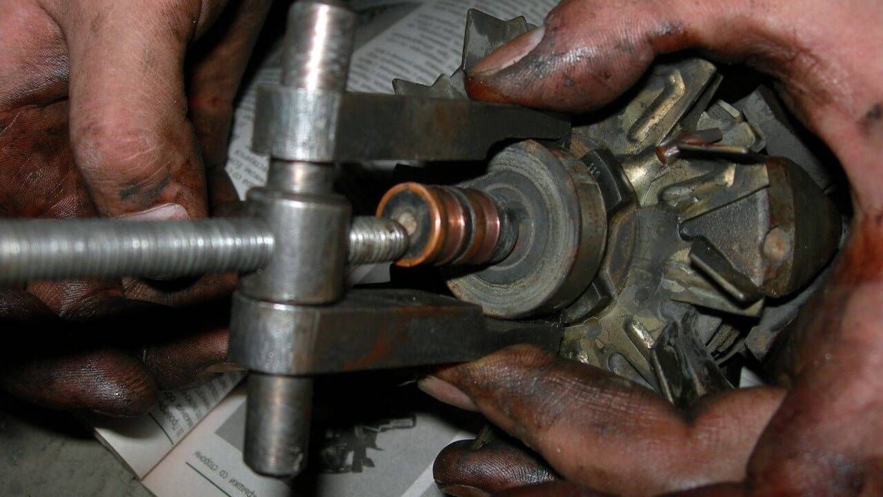 - Теперь ротор следует зажать в тиски и разобрать, выкрутив все необходимые гайки и сняв шкив с кольцом. Все вышедшие из строя элементы — регулятор напряжения, подшипники и другие составляющие меняются при необходимости. После этого агрегат собирается и ставится на место.