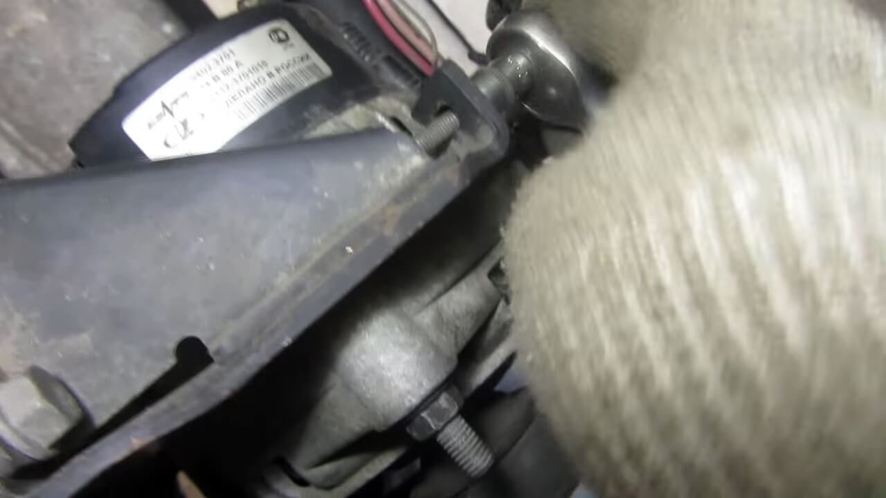 - Генератор на кронштейне установлен на длинном болту с гайкой. Достать его не очень удобно, поэтому головкой на «15» отвинчивают два болта крепления кронштейна к блоку. Их находят сзади генератора, один болт длинный, а другой короче. Теперь генератор можно повернуть по часовой стрелке и появится возможность для снятия оси его крепления к кронштейну;