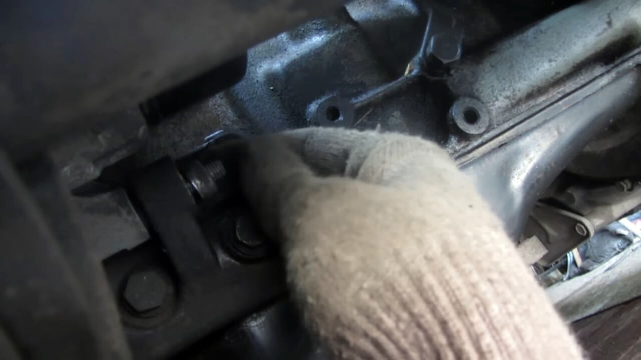 - Далее, выкручивается гайка, которая находится справа от механизма. Деталь нужно приподнять и извлечь шпильку — полностью вытащить ее не получится, поэтому извлеките ее на наиболее возможное расстояние. Для демонтажа агрегата шпильку придется разрезать, а при последующем монтаже устанавливается новая шпилька, только с противоположной стороны.