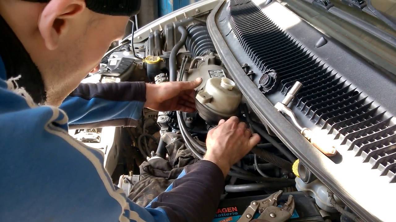 Изначально потребуются соответствующие условия, где вы сможете поднять машину полностью или вывесить передние колеса. Если нужно, старая жидкость сливается из расширительного бачка. Чтобы это сделать, снимается возвратный шланг с бачка и в него вставляется заглушка. Это не позволит гидравлической жидкости выливаться.