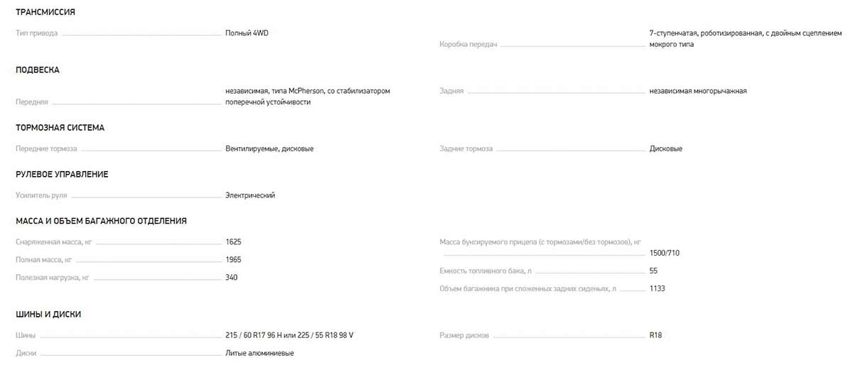 Устанавливается электромеханический стояночный тормоз, по стандарту автомобиль наделяется шинами 215/60R17 на литых дисках, в более заряженных версиях доступны колеса 225/55R18.