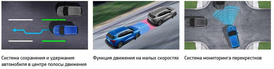 Также паркетник оборудуется ассистентами удержания автомобиля по центру дорожной полосы и ее сохранения (LCK и LKAS), предупреждения столкновений FCW, автоматического торможения AEB.