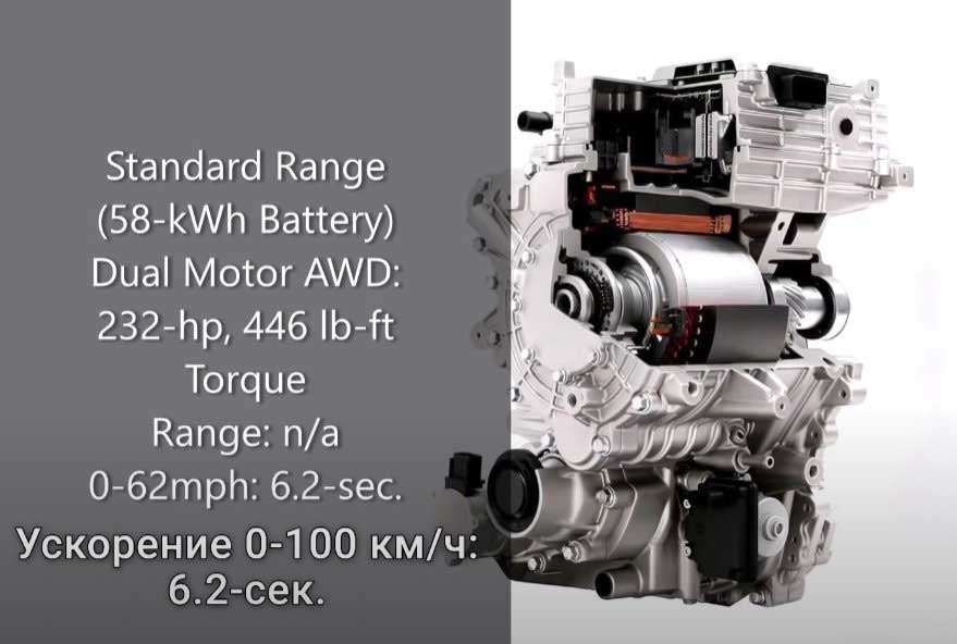 - высоковольтной батареей Standard Range 58 кВт*ч, она поставляется в варианте на заднем приводе с электродвигателем 125 kW (170 лошадиных сил), для полноприводных машин – с двумя движками суммарной мощностью 173 Kw (235 л. с.);