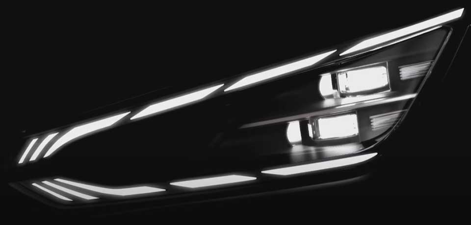 - треугольные передние фары, вытянутые по горизонтали, дополняются по своим двум длинным сторонам линейками светодиодов;
