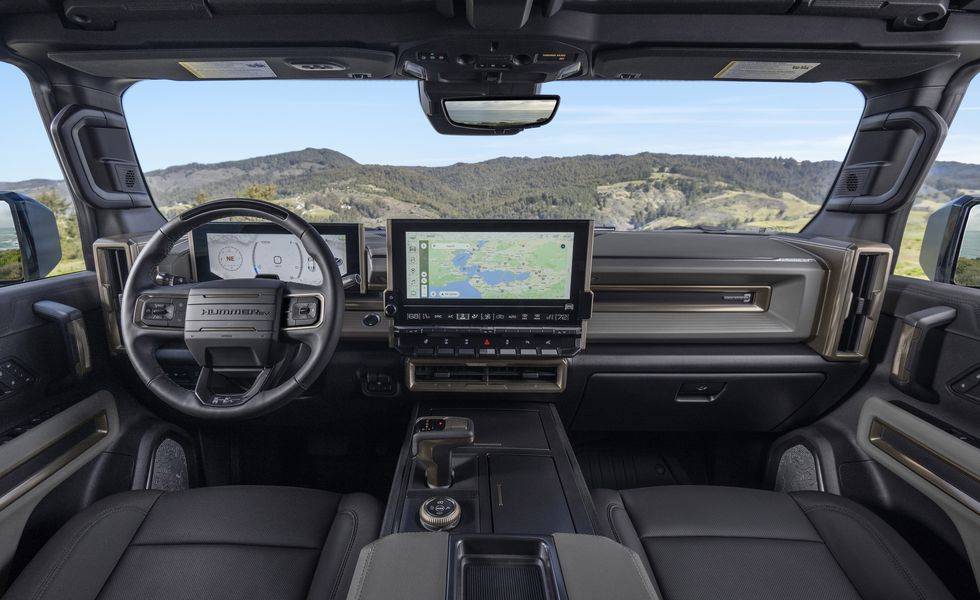 В отличие от внешности новой модели, которая немного похожа на прошлый внедорожник, то салон GMC Hummer EV сделали уникальным. Перед водителем установили цифровую 12.3-дюймовую приборную панель, выполненную в форме планшета. Отсутствует даже защитный козырек. Порадовало стильное, современное рулевое колесо, оснащенное массивным ободом, тремя спицами и традиционной надписью Hummer в центре «штурвала». Руль также обладает функциональными кнопками, а также лепестками, отвечающими за переключение передач.