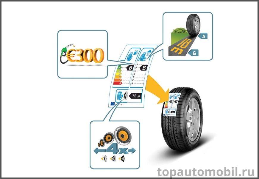 Производители шин, в соответсвии с международными требованиями, клеят на протектор новой шины наклейку (стикер), на которой в виде специальных значков указывают к какому классу относится данная шина по топливной экономичности, шумности и водоотведению для обеспечения устойчивости автомобиля на мокрой дороге.