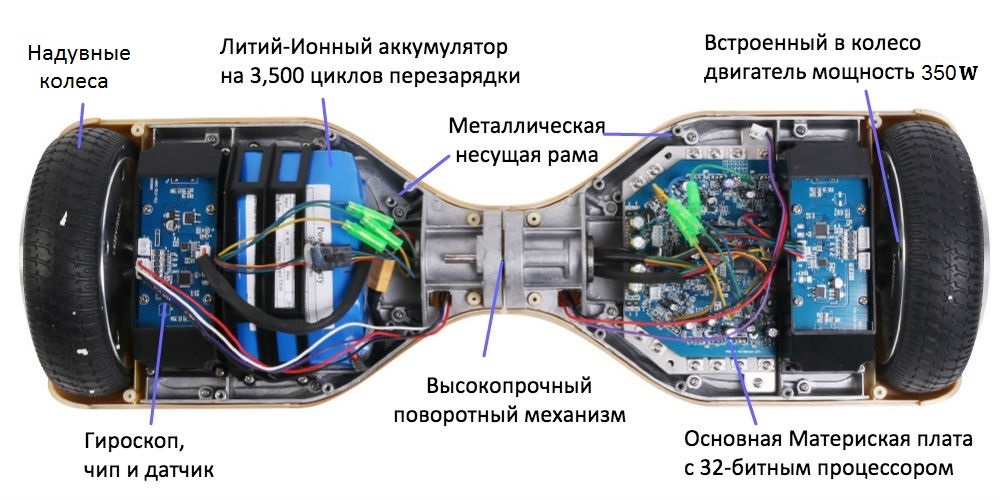 Принцип работы моделей основан на гироскопических датчиках. Эти приборы заполнены специальной жидкостью, поэтому способны определять изменение положения гироскутера в пространстве. Если устройство наклоняется вперед, действие мотора будет направлено на восстановление горизонтального положения. То же самое происходит при отклонении назад.