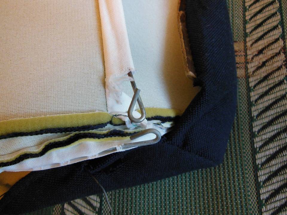 1. В Нижней части спинки снимаем с зацепов 1 проволоку натяжения чехла (с обеих сторон).