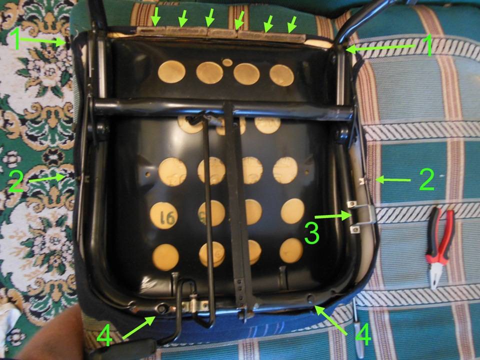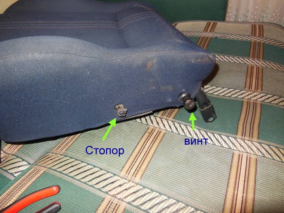 Принимаемся разбирать. С обеих сторон выкручиваем винты крепления спинки и сиденья, и снимаем стопоры.