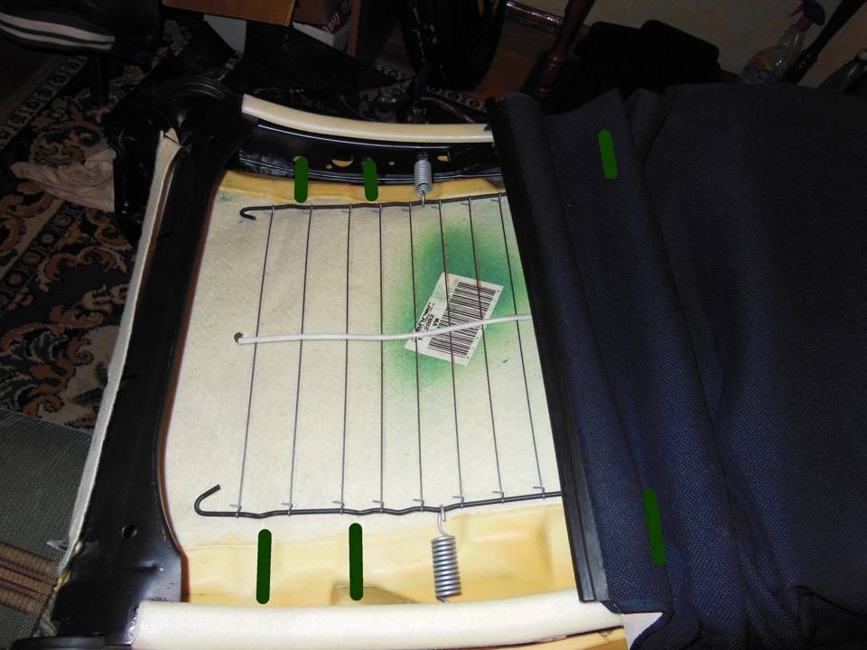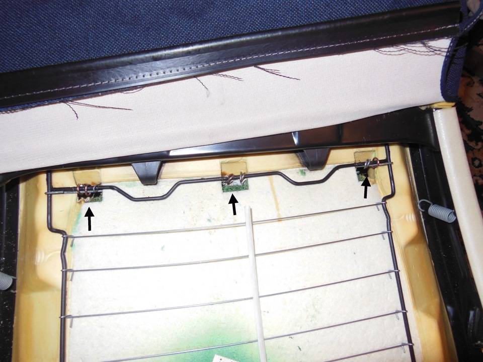 2. Со стороны спинки, с помощью крючка или съёмника пружин, снимает те самые пружины. Кол-во их с обеих сторон по 4 шт. (коричневым цветом указано их расположение на спинке. Для примера оставлено по одной пружине с каждой стороны)