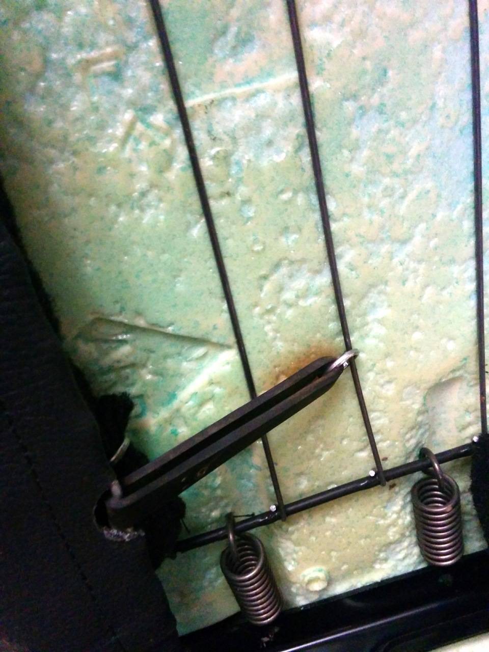 3. Чтобы не отцеплять еще целую кучу таких колец — снимаем саму проволочку, на которых они держатся о зацепления с каркасом кресла (“1” отцепляем от “2”).
