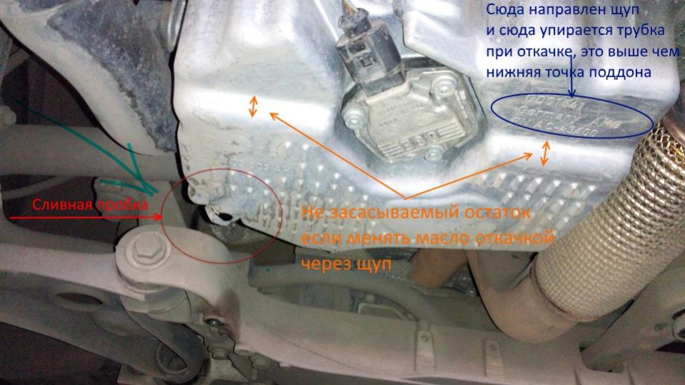 Во-вторых — зачастую через отверстие для щупа можно удалить заметно большее количество грязного масла, чем через сливное отверстие. В некоторых моделях автомобилей конструкция поддона картера такова, что после откручивания сливной пробки значительное количество масла просто не может вытечь, и его приходится оставлять там, смешивая со свежим маслом.
