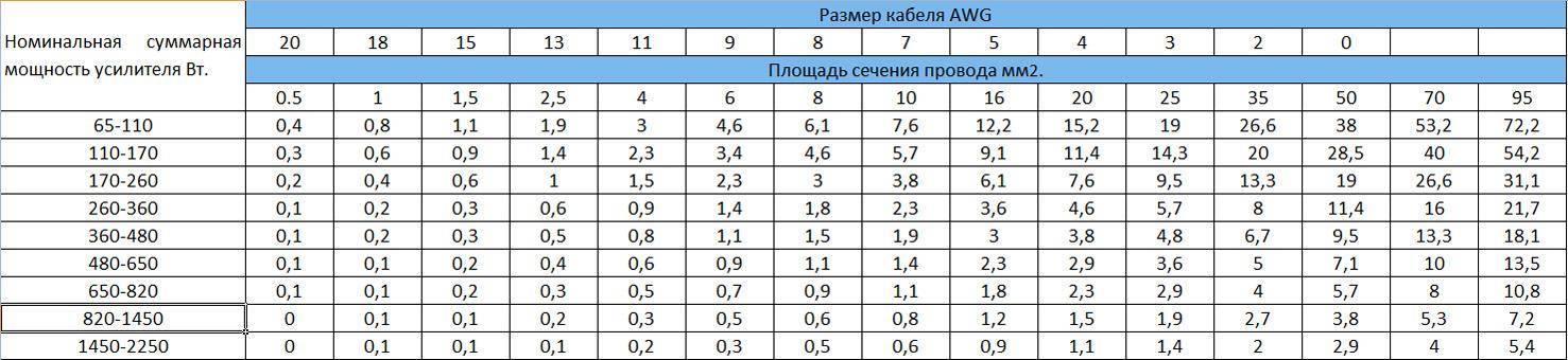 Вам уже известны сечение силового провода и длина. Следующая задача – подобрать правильный номинал предохранителя. Для этого воспользуйтесь таблицей, приведённой ниже.