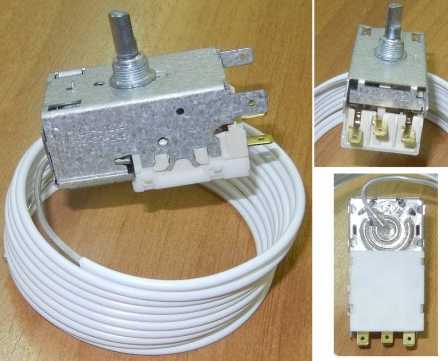 Термостат — это реле, включающее и отключающее холодильник в зависимости от температуры в камерах. С одной его стороны выходит герметичная сильфонная трубка, заполненная хладагентом, на противоположной стороне расположены клеммы для присоединения проводов. Конец трубки прикрепляется к испарителю.