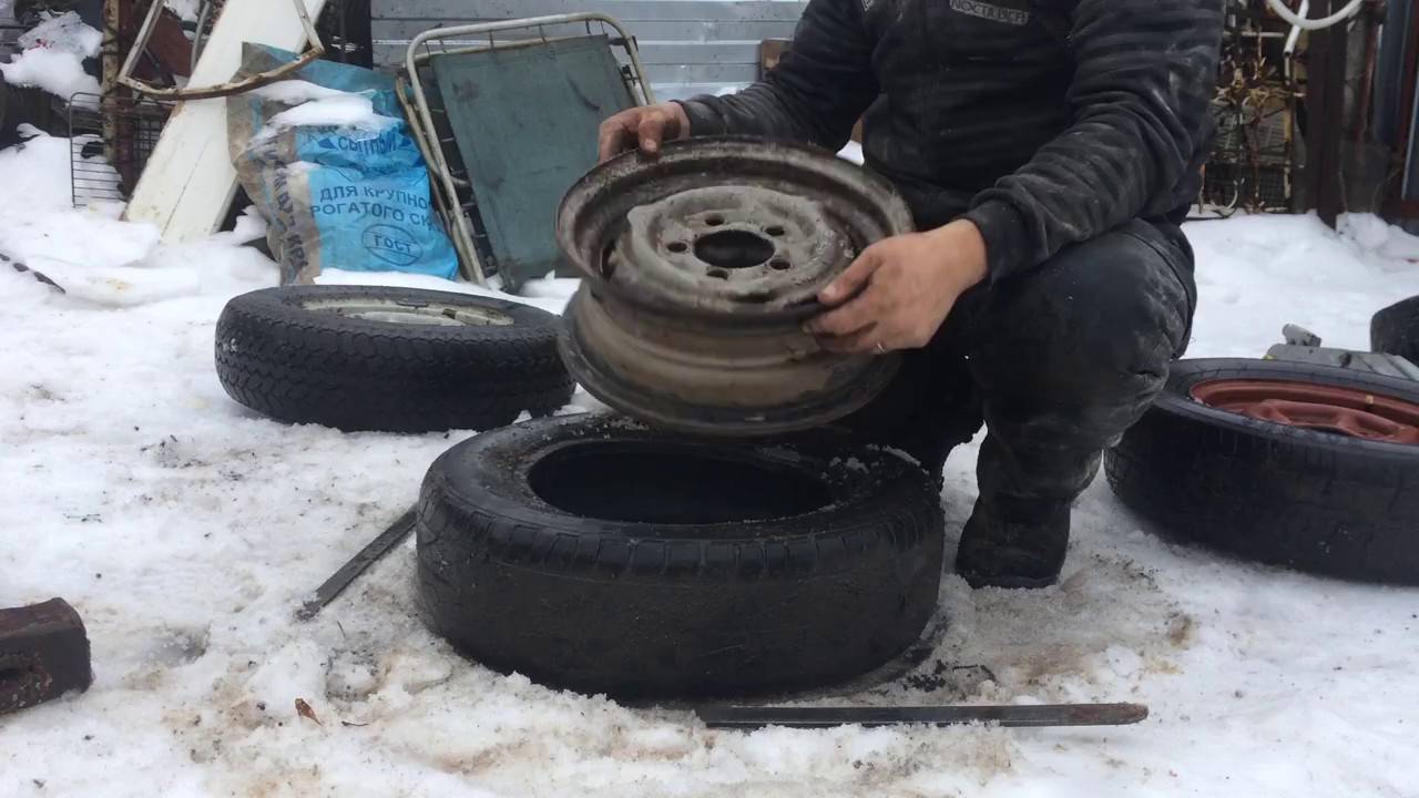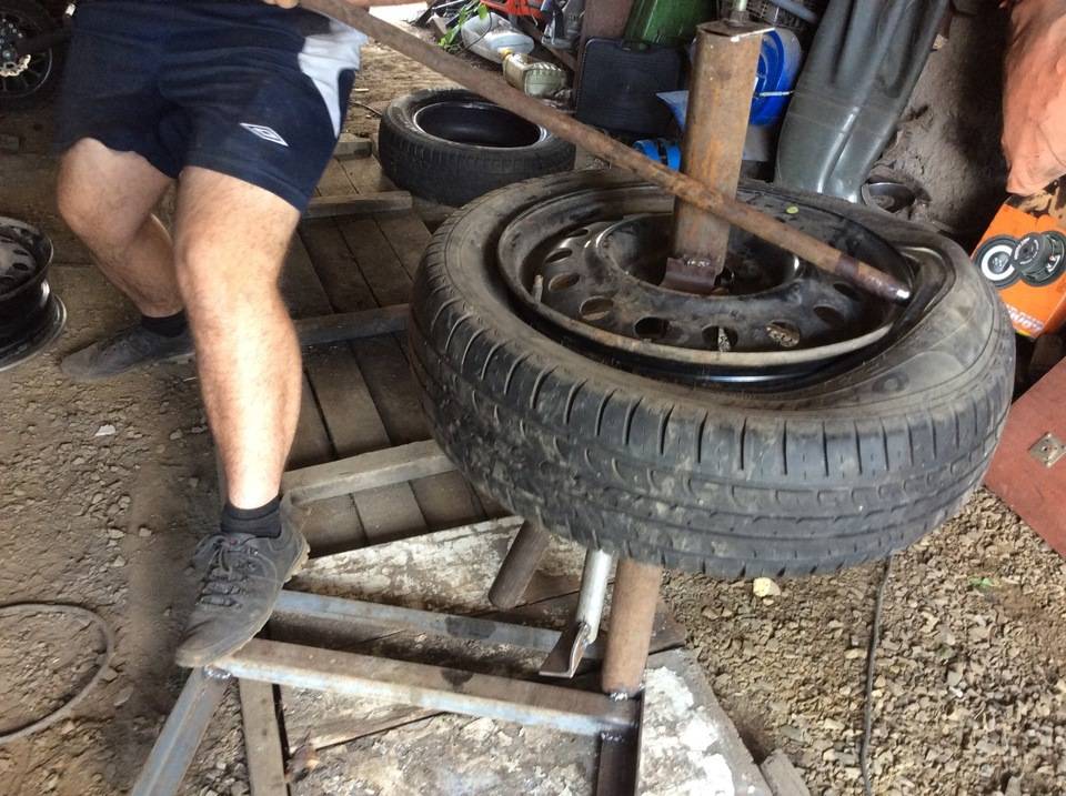После отделения бортов покрышки автомобиля от диска нужно было встать на нее и работать монтировками (переставляя их поочередно). Так постепенно из диска выводилась сначала одна сторона, затем другая.