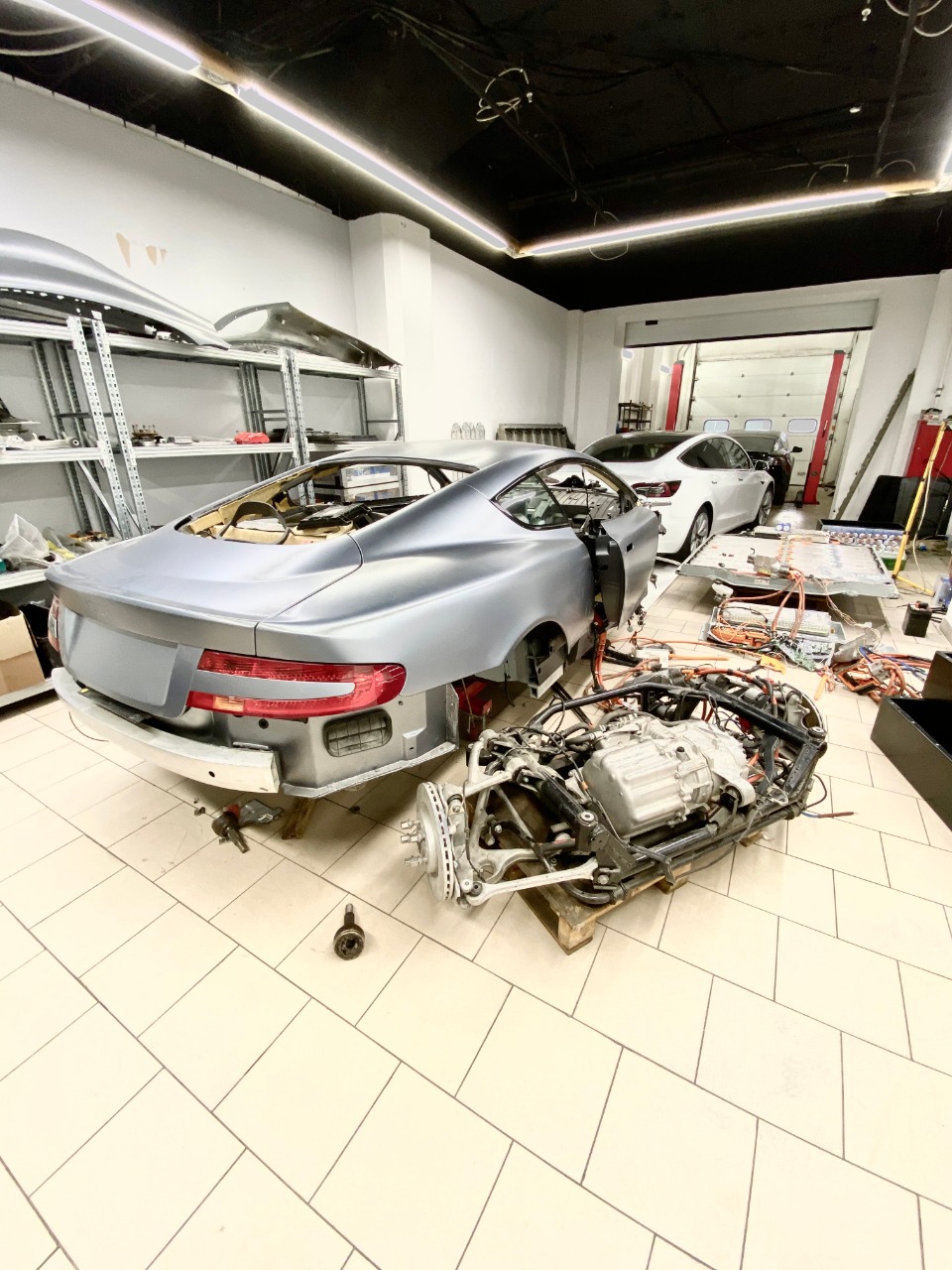 Вторым — переделка автомобиля Aston Martin DB9. В качестве электрической начинки использовались компоненты Tesla Model S: батарейка, два электродвигателя, вся электропроводка, водительский и центральный экраны