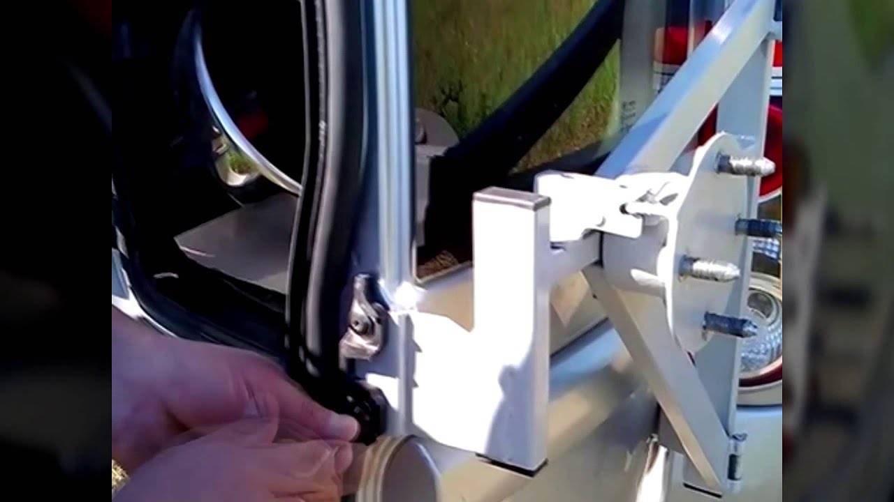 С усиленным вариантом крепления все ещё проще – достаточно отвинтить держатель слева и опустить его до земли. Теперь остаётся только открутить гайки и снять колесо. Запаску не придется даже поднимать, прилагая физическую силу. Она уже находится на земле, и ее достаточно подкатить к месту установки.