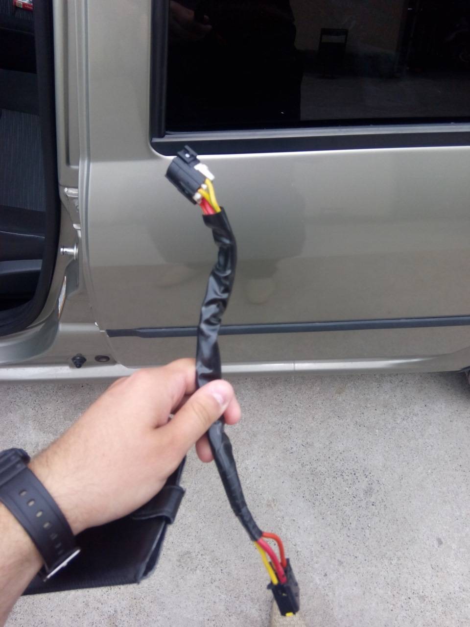 22. Расцепляем пластиковые защелки стеклоподъемника. 23. Опускаем черную обшивку которую мы привязывали. 24. Отводим обшивку от двери и выводим много жгутов проводов, в некоторых местах они на защелках. Защелки элементарные, открываются очень просто, при работе разберетесь. Рекомендую сделать фотографии какие жгуты как были проведены, собрать нужно все так же как и было. Выполняем необходимые операции и производим обратную установку обшивки двери на Рено Меган 2.