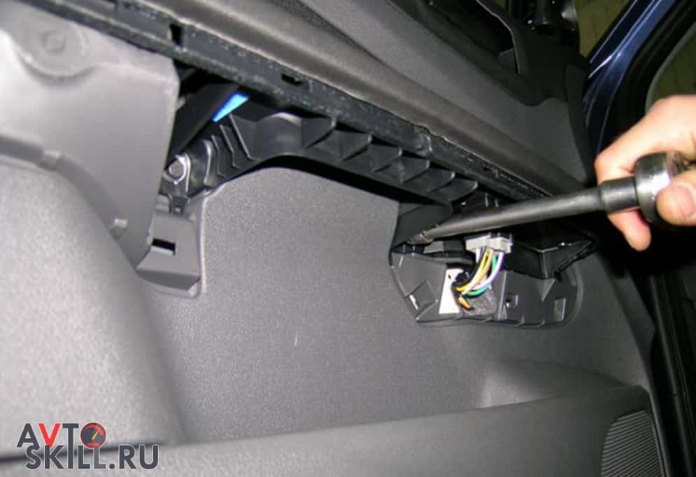 Чтобы не повредить панельный пластик, можно обмотать конец отвертки изолентой. Можно воспользоваться пластмассовыми клипсодерами, которые имеют характерный изгиб, позволяющий быстро и удобно производить подобные операции.