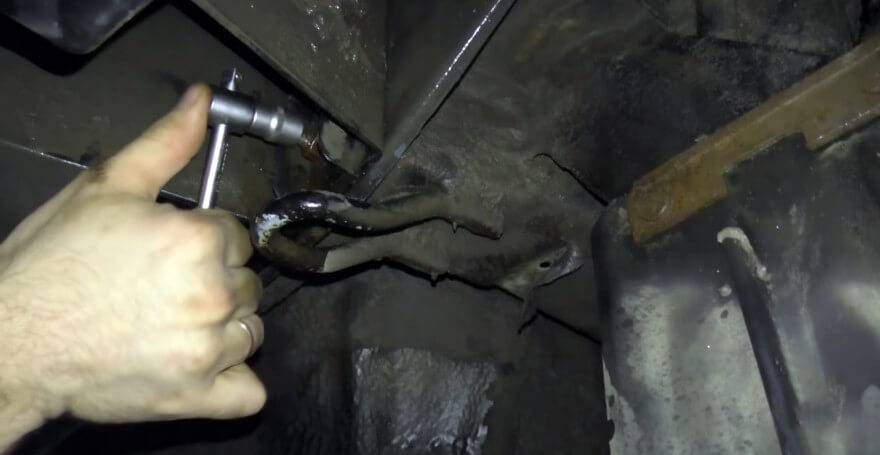 - Ключом на 10 отворачиваем две гайки нижнего крепления к кузову.