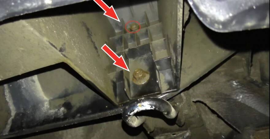Заглянув снизу, Вы увидите две гайки на 10, которые и следует открутить соответствующим ключом.