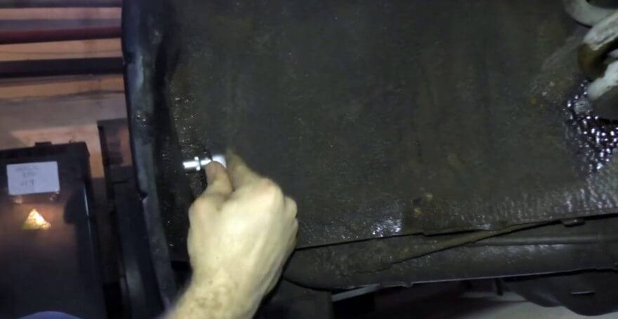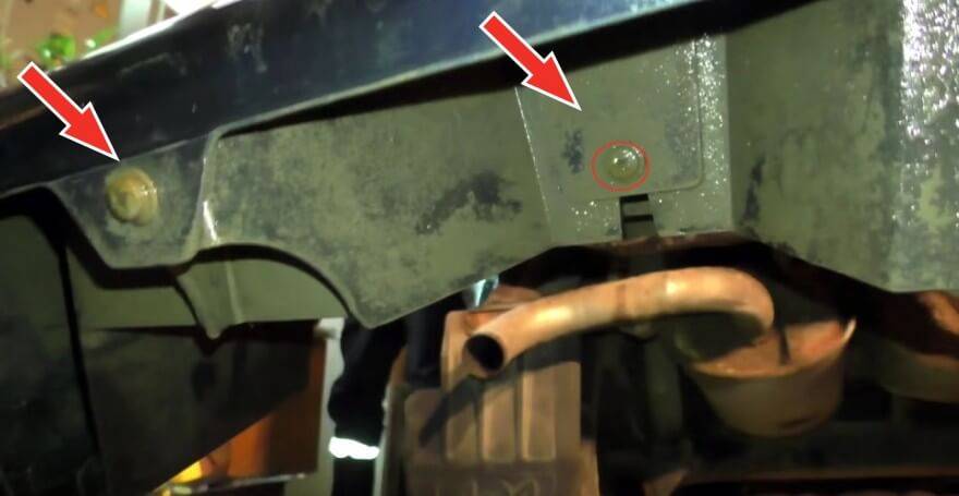 - На первом этапе потребуется открыть защиту, которая располагается на передних колёсах. Для этого придётся удалить 3 самореза. Проще всего использовать для этого отвёртку.