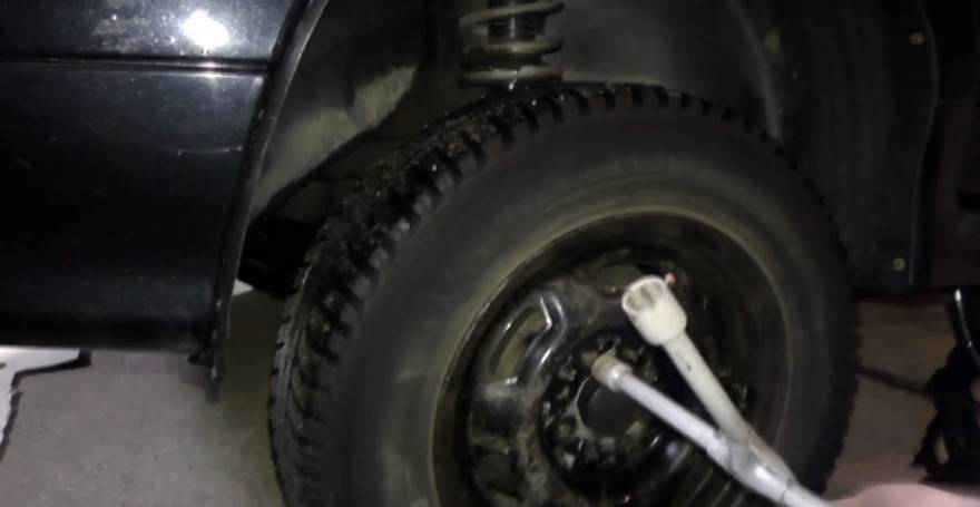 1. Баллонным ключом «на 17» откручиваем 4 болта колеса и снимаем его.
