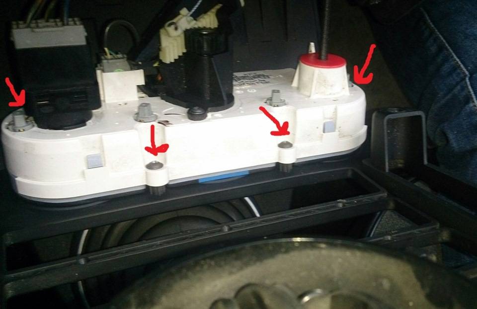 Выкрутите четыре самореза в углах. Постарайтесь не уронить саморезы, их практически невозможно найти под передней консолью!Головное устройство Ford Focus крепится к панели четырьмя саморезами по углам