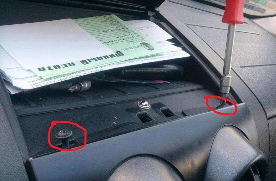 - Снять корпус перчаточного ящика, сжав боковины руками. Демонтировать фиксаторы головного устройства при помощи тонких металлических пластин. Инструмент устанавливается в 4 паза, имеющихся на передней панели магнитолы, рабочие стороны имеют подрезку.