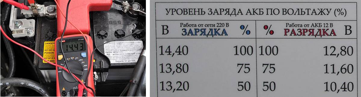 - Степень заряженности требуется проверять каждые 2-4 недели. Сделать это самостоятельно можно, используя мультиметр. Нужно завести двигатель и подсоединить щупы прибора к клеммам АКБ.