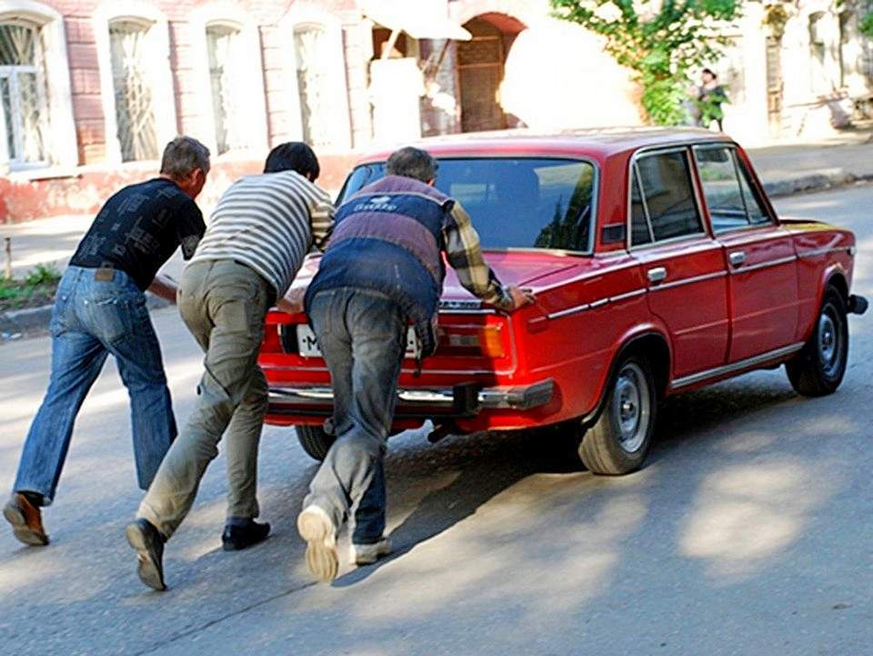 Группа поддержки при попытке завести машину с толкача