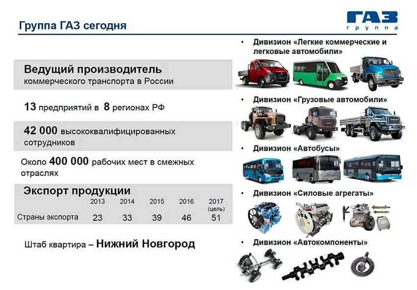 На рынке России за первое полугодие 2017 года Группа ГАЗ занимает в сегменте LCV по бортовым моделям 74% (76% за аналогичный период прошлого года), по ЦМФ, соответственно, 35% против 31%, но особенно заметен рост по микроавтобусам – 44% против 36%. В сегменте MCV (среднетоннажников) ее доля составляет 71% против 70% годом ранее. Таким образом, отвечающий за эти сегменты АЗ ГАЗ (Горьковский автозавод) фактически вернул себе за счет нового семейства NEXT уверенное лидерство в таких важных сегментах рынка, как цельнометаллические фургоны и микроавтобусы, где ранее его продукцию («Газель БИЗНЕС») серьезно потеснили иномарки. В сегментах же бортовых и фургонных LCV и MCV его фактической монополии и так ничто не угрожает. Тем не менее, останавливаться на достигнутом Группа ГАЗ не собирается и продолжает расширять линейку моделей.