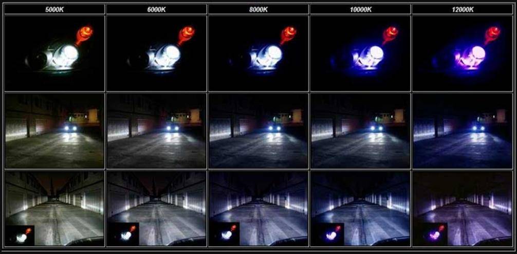 Ксеноновые лампы способны светить ярко и хорошо освещают дорогу. При этом следует правильно подбирать лампы по «температуре». Если коротко, ксенон 4300К формирует более желтое свечение, 5000К ближе к сине-белому свету, тогда как, например, 6000K имеют голубовато-белое свечение.