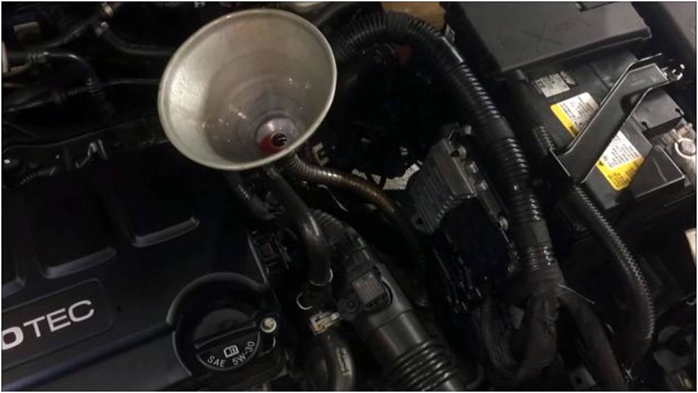 - Заливное отверстие находится под капотом. Снять сапун и вставить в отверстие шланг, а в другой конец шланга воронку.